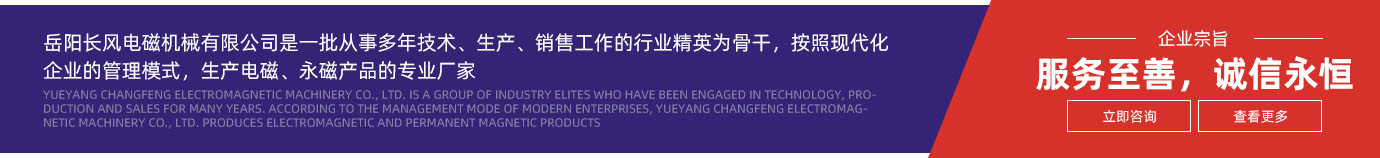 岳陽長風電磁機械有限公司是以原岳陽起重電磁鐵廠一批從事多年技術、生產、銷售工作的行業精英為骨干,按照現代化企業的管理模式,經過資產重組而組建成立的新型科技型股份制企業。工廠既繼承了原岳陽起重電磁鐵廠三十多年來積累的電磁產品開發與生產的理論和實踐經驗,并加以開拓創新,發揚光大;又改變了原國有企業陳舊的管理制度與作風。企業如朝陽噴薄,正不斷發展壯大,具有較好的發展前景。